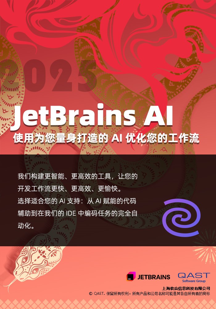 JetBrains AI——使用为您量身打造的AI优化您的工作流。 我们构建更智能、更高效的工具,让您的开发工作流更快、更高效、更愉快。 选择适合您的AI支持:从AI赋能的代码辅助到在我们的IDE中编码任务的完全自动化。