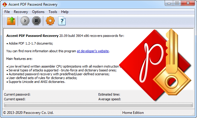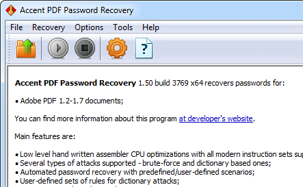Accent PDF密码恢复 (AccentPPR)会立即删除权限密码,并在Adobe PDF的所有版本中以最大速度恢复文档打开密码。