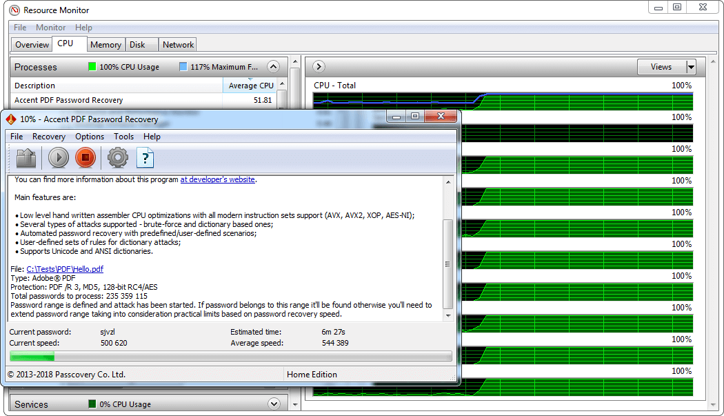 恢复文档打开密码文档实际上是通过对一系列可能的密码运行暴力攻击来执行的。强调PDF密码恢复经过完美优化,保证了在任何现代CPU上的最佳暴力速度,无论是英特尔还是AMD。