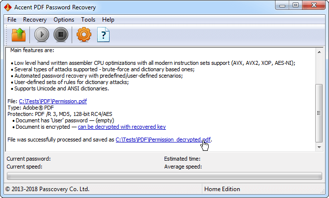 强调PDF密码恢复支持AdobePDF文件的所有版本,并恢复两种类型的密码:打开的密码和权限密码。