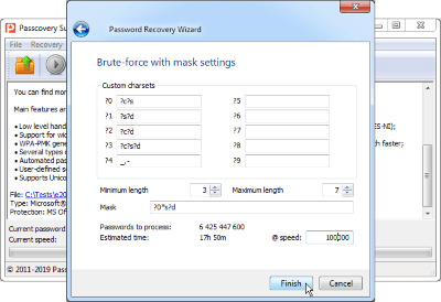 范围越小,恢复密码所花的时间就更少了。强调PDF密码恢复允许为生成的密码的每个位置单独配置字符集,并仅尝试那些符合扩展掩码选项定义的条件的密码。