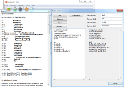借助Accent PDF密码恢复功能,您可以组合多达四个词典,并根据您的自定义突变规则更改生成的密码。这些规则是借助"规则编辑器"中实现的内置宏语言定义的,该语言允许在您进行时预览更改。