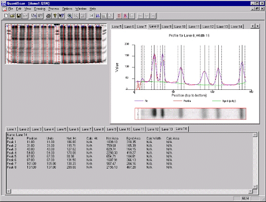 用于Windows的QuantiScan具有与复杂的光密度计相似的功能,但价格却低廉。它能够分析各种材料,包括聚丙烯酰胺和琼脂糖凝胶,放射自显影图,TLC板等。该程序将直接从任何TWAIN兼容扫描仪以及大多数BMP,JPG或未压缩的TIF文件接受图像进行分析。对于质量合理的泳道凝胶,分析是高度自动化的,可实现极高的数据通量。使用Quantiscan的手动模式几乎可以分析任何类型的图像。
