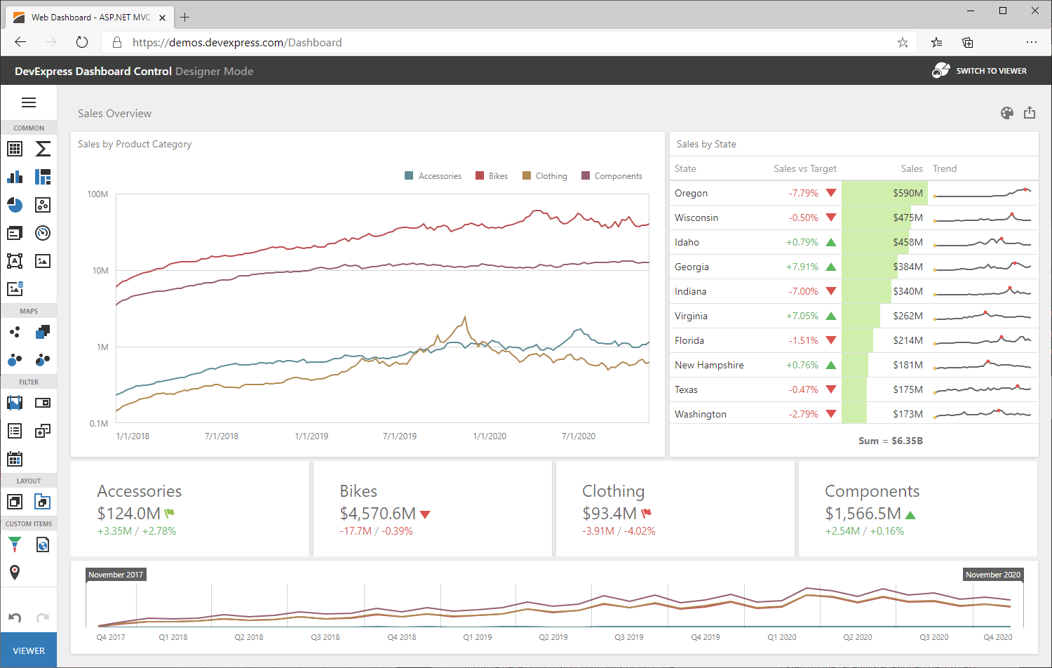 创建和分发免版税的决策支持系统,并在整个企业范围内轻松共享商业智能(BI)。将我们直观的仪表板设计器与我们的仪表板查看器一起使用,并为您的下一个WinForms,WPF,Web窗体,ASP.NET Core和Angular / React / Vue项目提供高影响力的仪表板。