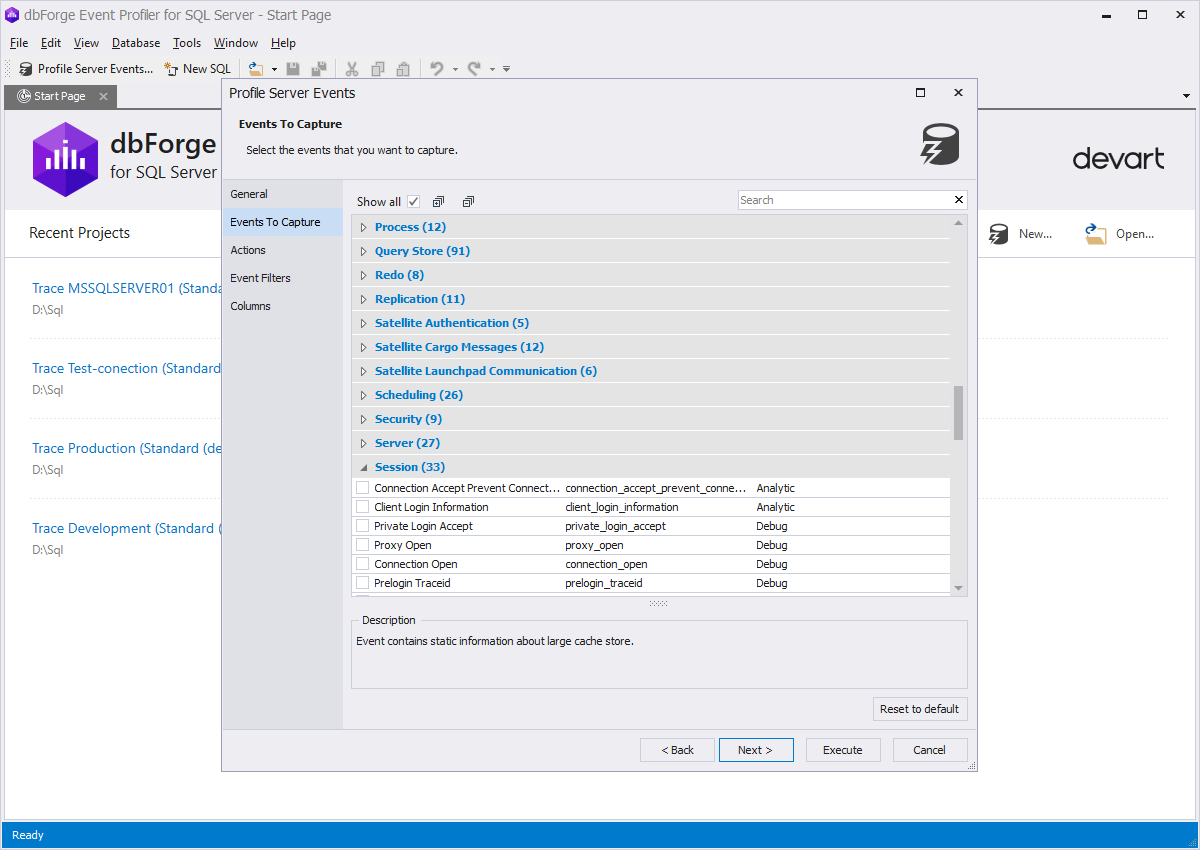 - dbForge Event Profiler捕获所有可能的事件类型,以将其包含所有详细信息以适合单个文档,以供将来进行审核和分析。