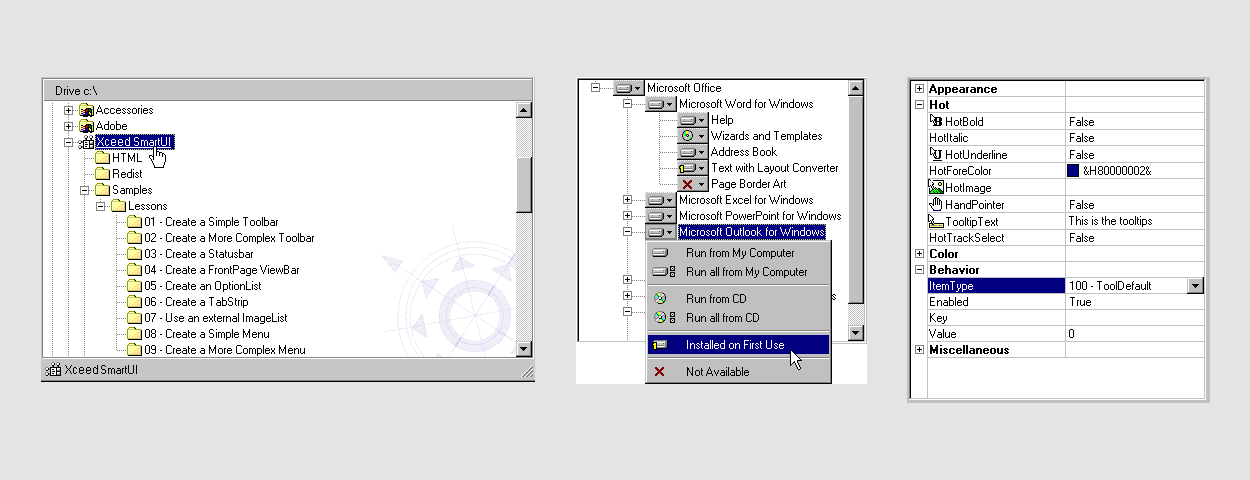 Xceed SmartUI for VB6中包含的控件提供了常规VB6控件所没有的附加属性。这包括对项目尺寸和自适应菜单的精确控制。独特的能力。创建自己的控件的能力如何?或者能够将任何类型的项目(按钮、组合、文本框等)添加到任何菜单、工具栏、树视图等。这就是它被称为“智能”的原因。