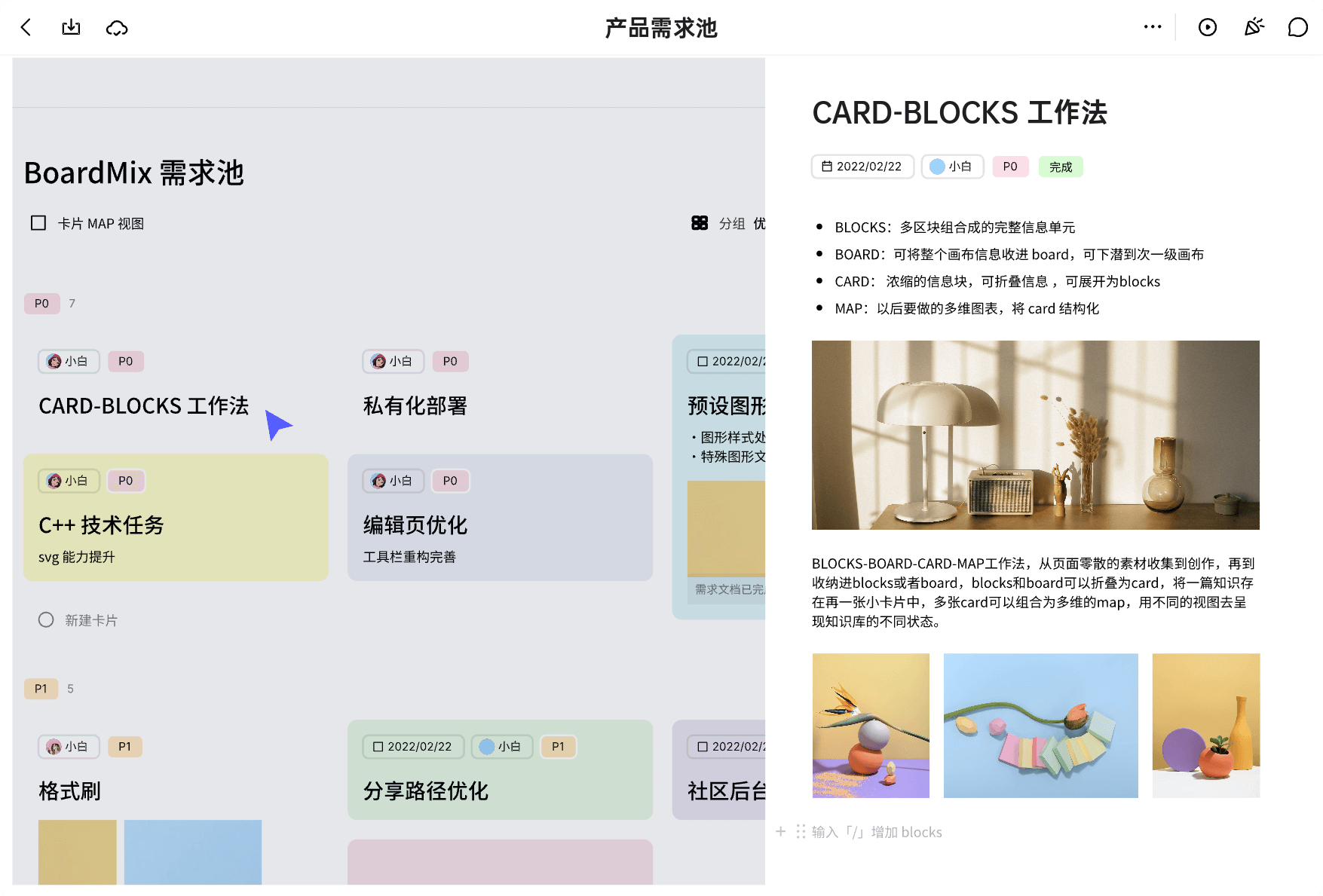 - 收集想法、记录反馈并组织研究:将文档、作品折叠进card,再通过看板管理,轻松在一个画布实现灵感、思考创作、收纳管理的全流程