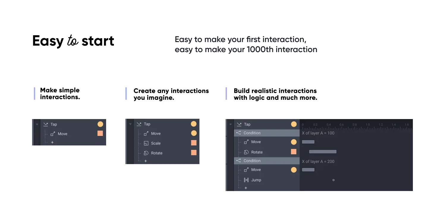 快速将你的创意变成真实的游戏体验-为移动端&电脑游戏和游戏机中的用户体验制作原型,如Xbox系列、X/S或PS5——创作出可播放的、真实的、完全沉浸式的高保真原型。ProtoPie,游戏交互设计的不二选择。