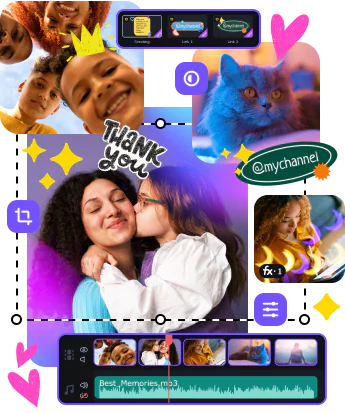 拥有超过 165 种奇妙的视觉效果和滤镜、超过 105 种过渡效果、超过 100 种标题和贴纸,让您尽享欢乐世界。使用现成的模板或创建您自己的故事。