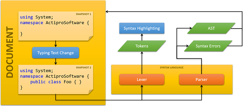 l 解析器-解析可以在工作线程中运行,是对文本执行语法和/或语义分析并输出某种解析数据的过程,通常是 AST(抽象语法树)和语法错误集合。