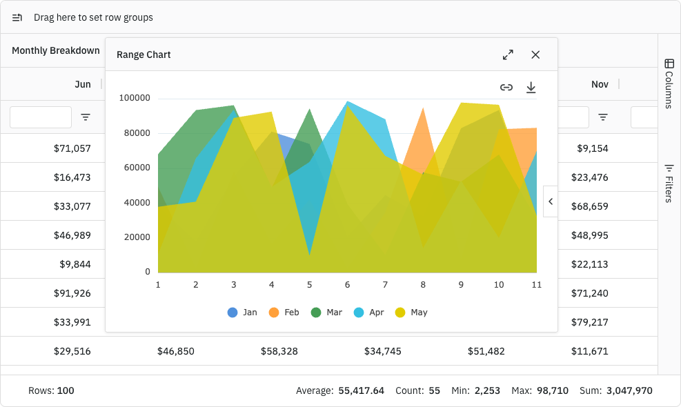 由 AGCharts 提供的集成图表-允许您的用户直接从网格中使用图表来可视化数据。由 AG Charts提供