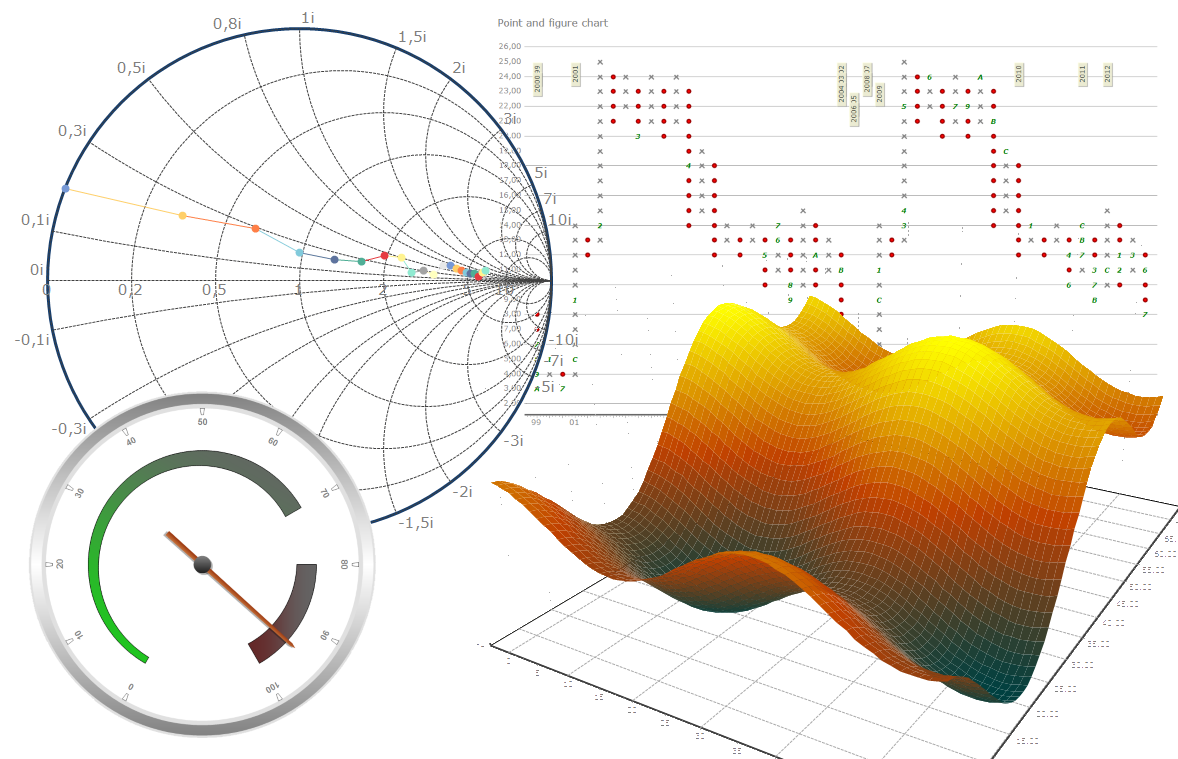 Chart组件具有生成高级金融Chart应用程序的功能。功能和指标包括:开盘-高-低-收盘系列、蜡烛、交易量和移动平均线聚合/发散 (MACD)、ADX、随机指标、布林线、动量、移动平均线以及更多统计功能。增强的Chart类型包括 Surface、ColorGrid、Smith 和多种仪表类型。