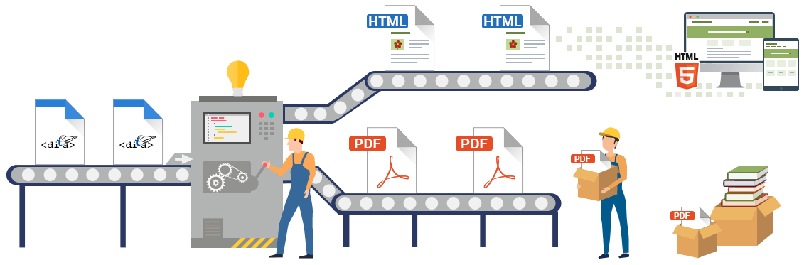 Oxygen XML Editor/Author 提供将 DITA 内容转换为 WebHelp、PDF、ePub 和纯 HTML 输出的内置支持。此支持还可以作为单独的工具包提供,以便于与自动化流程集成。这意味着您可以使用集成服务器来运行转换并发布输出,或者只是从命令行界面使用它。