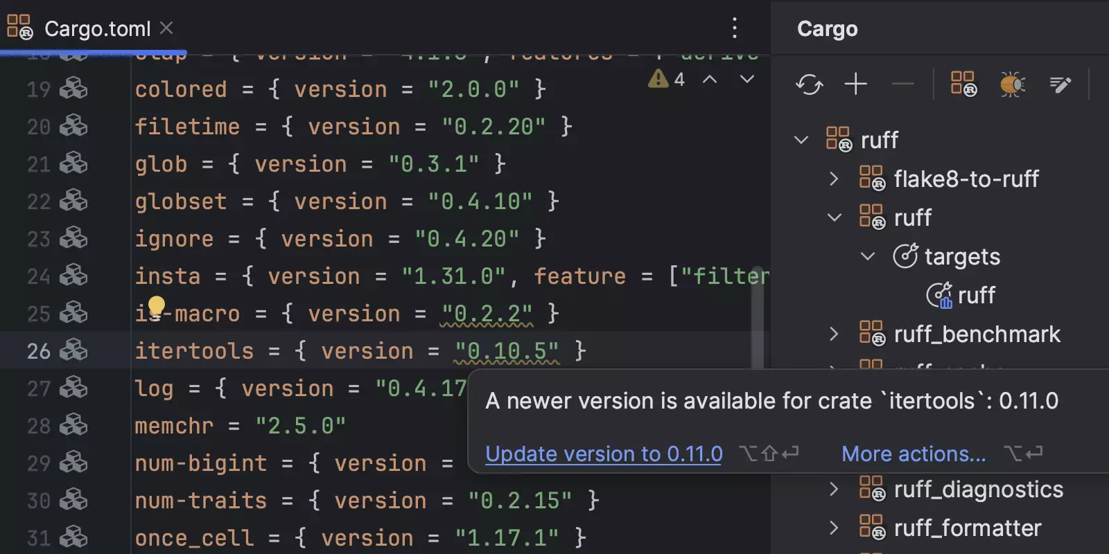 管理项目及其依赖项-借助代码洞察与完全 Cargo 集成,编辑 TOML 文件。您还可以管理整个工作区,以及在专用工具窗口中运行 Cargo 命令。