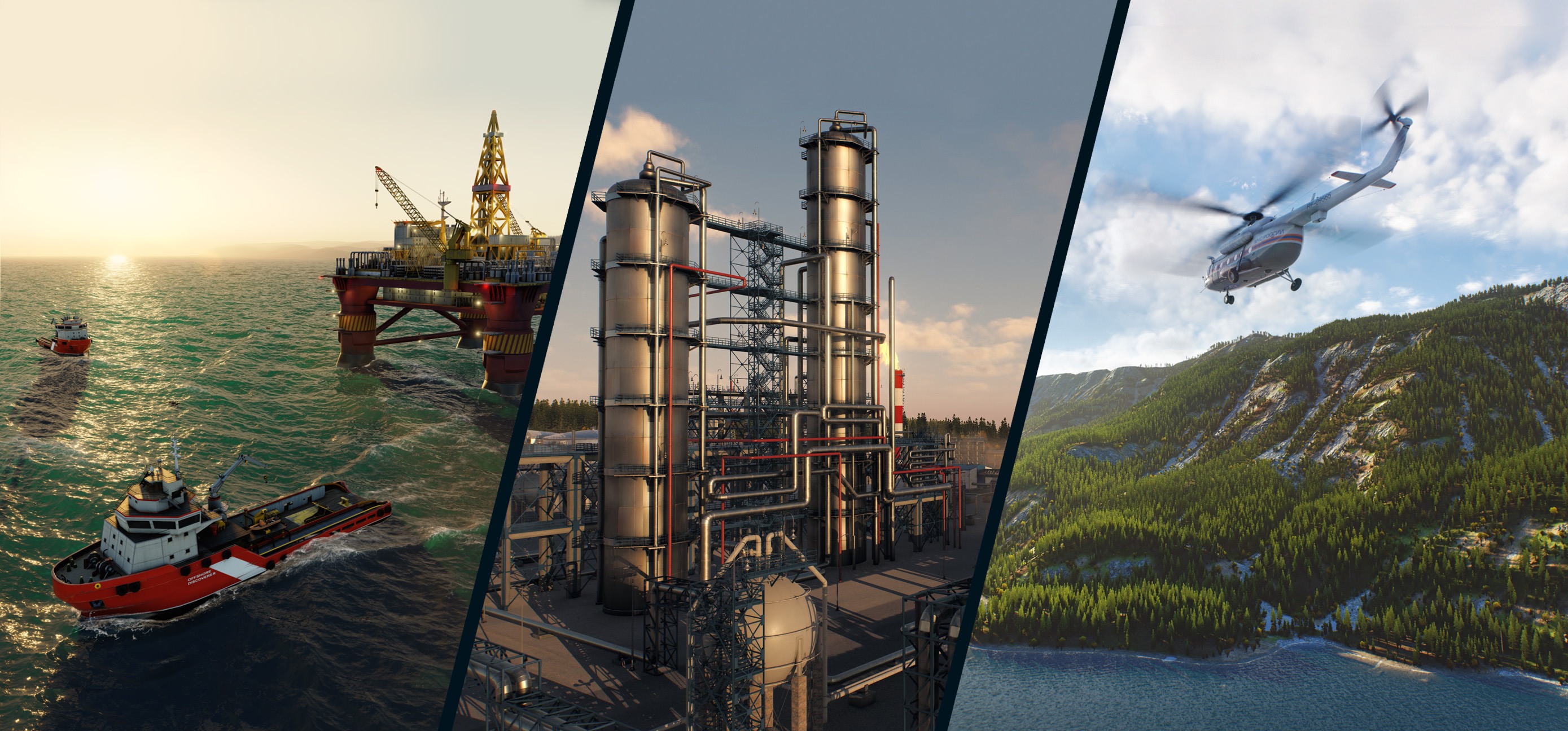 炼油厂的实时 3D 可视化是 BIM(建筑信息模型)概念应用于工业设施(工业数字孪生)的交互式展示。从施工周期到运营和维护的所有流程都可以以 3D 形式可视化,并实时链接到从物联网传感器和其他数据源收集的大数据。交互式模型可以模拟石油和天然气行业的不同场景,并有效地规划设施改进。VR 应用可快速进行技能培训,并让员工详细了解现场情况。可在同一系统内进行技能验证和详细的事后回顾,并结合随机故障模拟,以防止作弊。