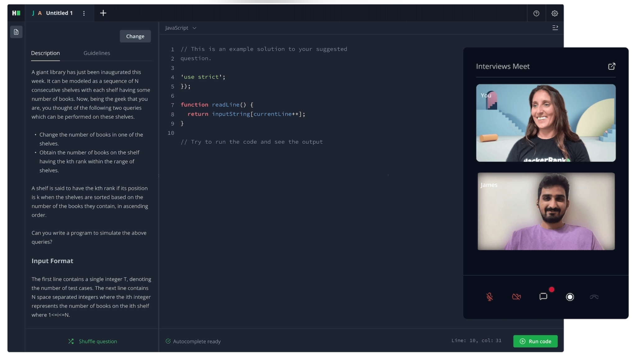 o 面试官和候选人可以在同一界面中实时编写、运行和调试代码。