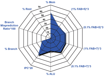 EEMBC benchmark测试特性数据使设计人员能够更好地了解如何解释相对于某些处理器特性的 EEMBC benchmark测试分数。上面的 Kiviat 图以一种易于揭示程序行为的方式可视化多变量数据,显示了 Networking 中服务质量benchmark测试的工作负载特征。