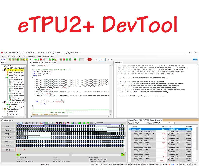 · 通过 eTPU2+ 提供 NXP eTPU 所有功能的完整模拟 - ASH WARE 的 eTPU2+ 开发工具提供精密且周期精确的 eTPU1/2/2+ 模拟,并具有调试功能,例如集成的图形波形查看器、代码覆盖率分析、变量和监视窗口、跟踪、直接寄存器修改、数据验证和测试验证。还有许多其他功能可以加快您的开发速度并帮助提高代码质量 - 有关更多信息,请参阅参考手册。