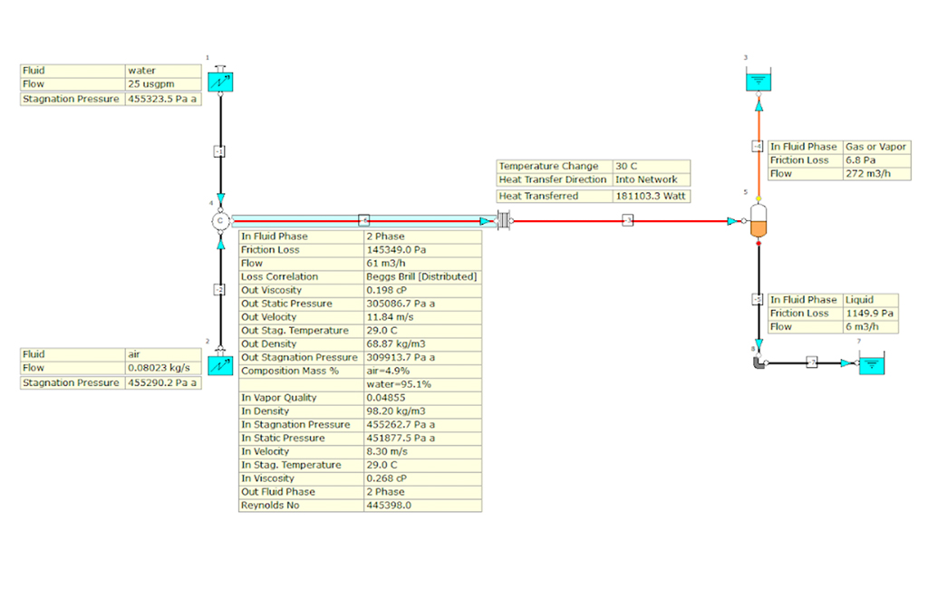 在流程图上混合不同的流体-该流程图显示了两个已知的流动边界节点,分别代表系统入口条件。分配给第一个边界的流体是固定的空气流速,而固定的流速是分配给第二个边界的水。这是具有恒定质量的两相流的示例。这些流体在结节点 4 处结合,成为两相流体,随后通过板式换热器加热,然后流向分离器。在分离器处,气相从分离器顶部排出,液相从底部排出。