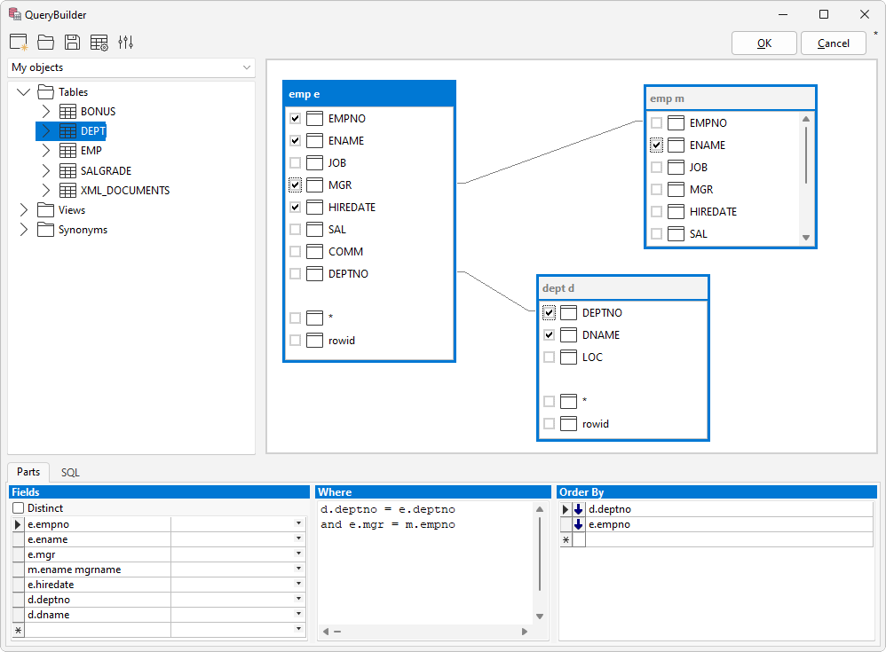图形化 Query Builder 使创建新的 select 语句或修改现有语句变得容易。只需拖放表格和视图,为字段列表选择列,where clause 和 order by clause,根据外键约束定义连接表格,即可完成。