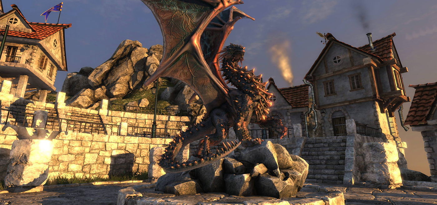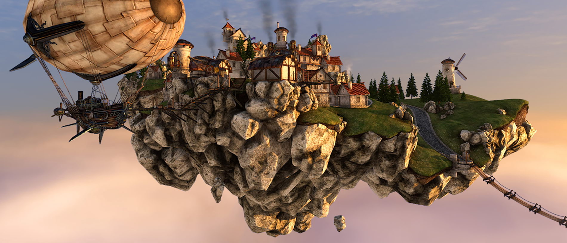 该软件将用户带入一个充满魔法与蒸汽朋克元素的奇幻世界:闪亮的黄铜构件、木质结构与精密齿轮交织呈现。悬浮空岛上的小镇拥有被阳光晒暖的鹅卵石街道,云海之上翱翔着精心打造的飞艇,中央广场盘踞的威严巨龙更赋予场景真实的冒险氛围。通过飞行俯瞰与步行漫游两种交互模式,用户可全方位探索这个世界的每个角落。