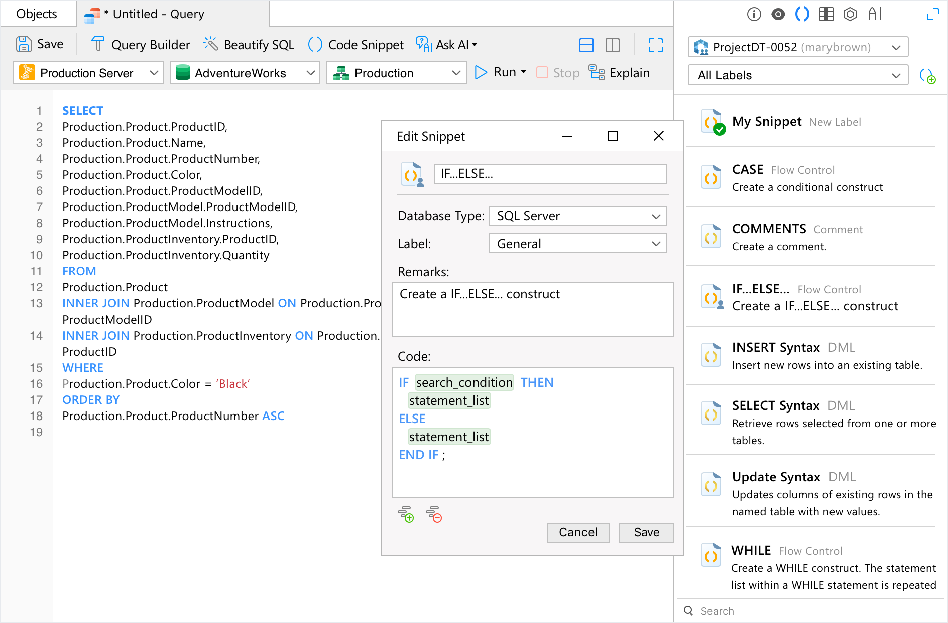 通过清晰且响应迅速的界面管理数据库对象,该界面将查询写入分解为结构化选项卡。允许您在每一步都更有信心和准确地编写复杂的查询。