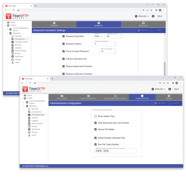 Titan FTP Server集成了您正在使用的目录服务——Active directory或LDAP。如果您的组织不使用其他目录服务进行身份验证,Titan还支持本地身份验证。Titan直接通过AD或LDAP服务器验证权限和访问权限,而不是导入副本。这确保了Titan使用最新的访问控制列表,并且管理员不必在多个位置添加或更改用户。对于Titan Enterprise+,这促进了无与伦比的可伸缩性。