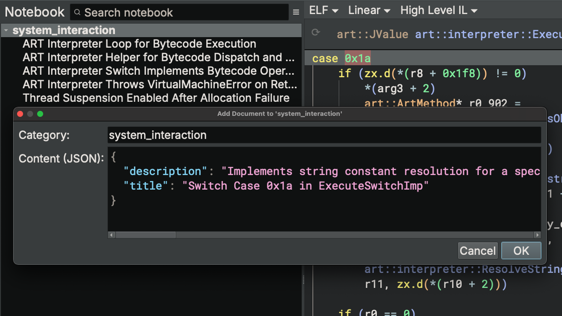 Sidekick 会维护一个工作笔记本,记录从二进制文件中收集到的各种见解,并持续利用这些见解来增强其分析能力。您也可以记录自己的发现,以便于查阅和控制。