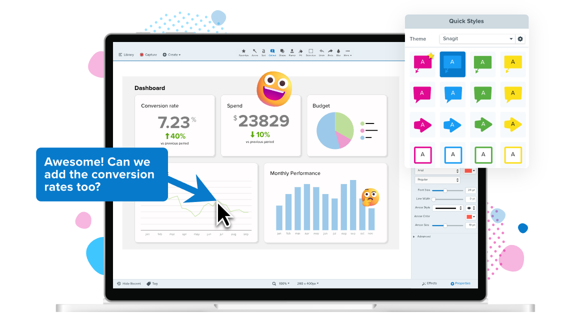Snagit是适用于 Mac 和 Windows 的优秀截图工具。使用 Snagit,您可以快速抓取屏幕截图、录制屏幕并添加注释,清楚地传达流程和概念。