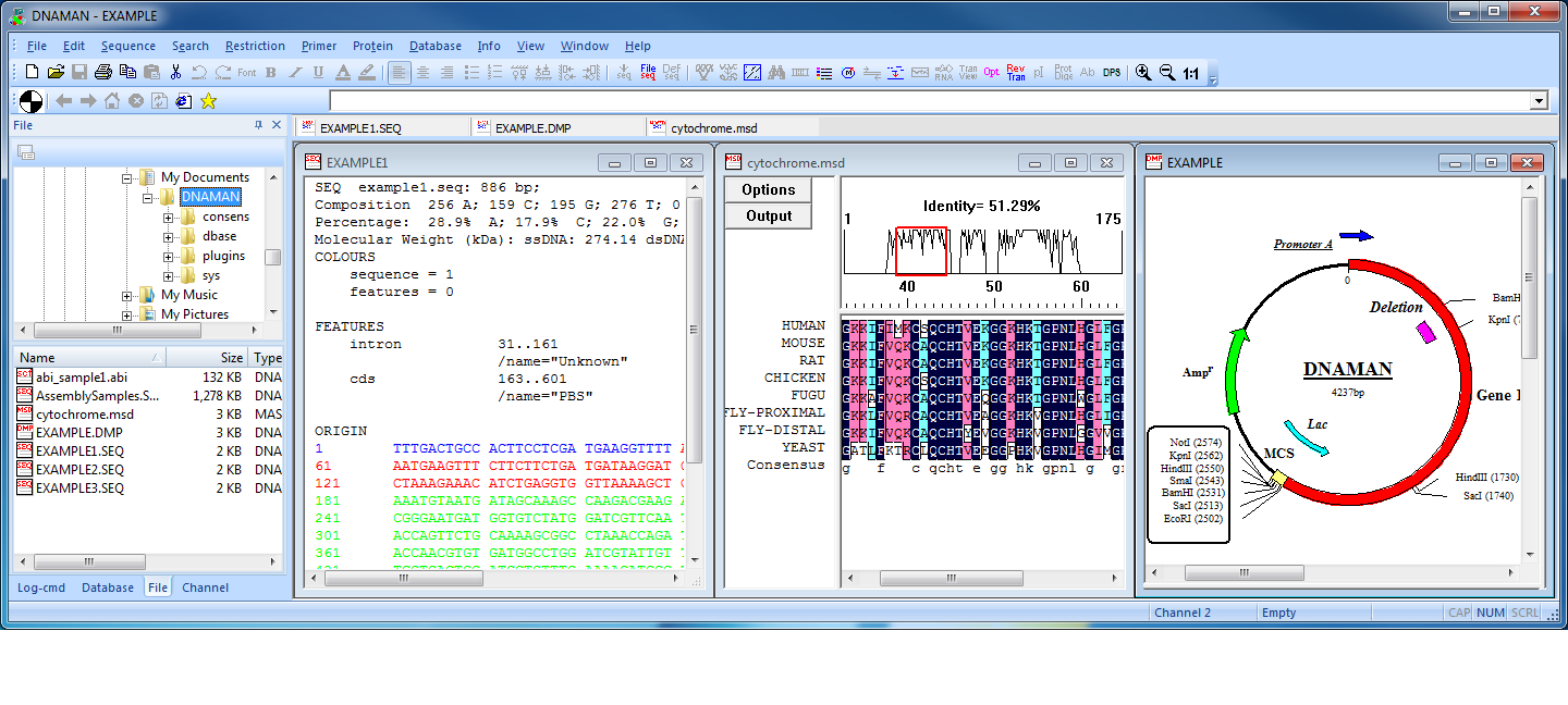 DNAMAN 是用于分子生物学应用的一对一软件包。该软件包提供了一个 具有多功能的集成系统,用于高效序列分析。您不再需要一个程序进行限制性分析 ,而需要其他 程序进行多序列比对 、设计 PCR 引物、蛋白质序列分析或绘制质粒……DNAMAN 为您执行所有这些任务。