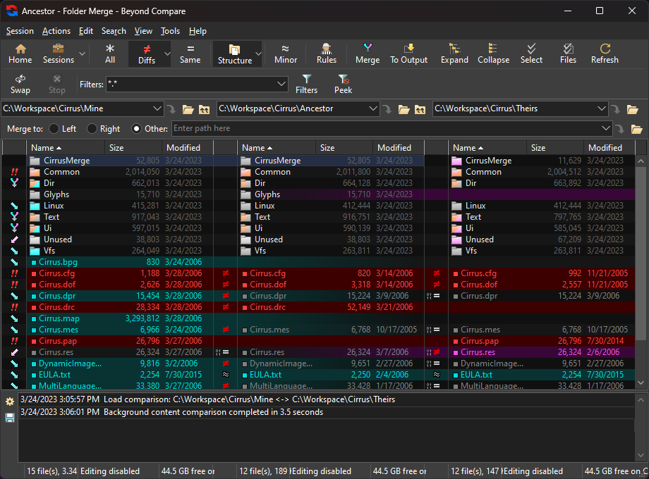 Beyond Compare 的合并视图允许您将文件或文件夹的两个版本的更改合并到单个输出中。 其智能方法允许您快速接受大多数更改,同时仔细检查冲突。