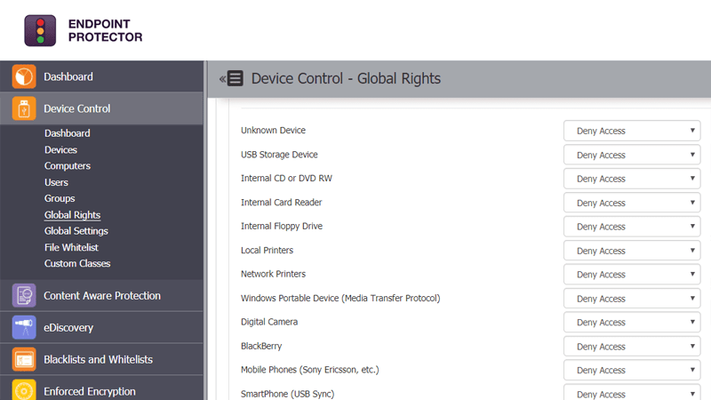 预定义策略可用于快速、无忧的部署。还可以通过指定可以使用或不能使用哪些设备、创建设备白名单和黑名单以及为用户、计算机或组定义策略,轻松应用更精细的设置来满足不同部门的要求。
