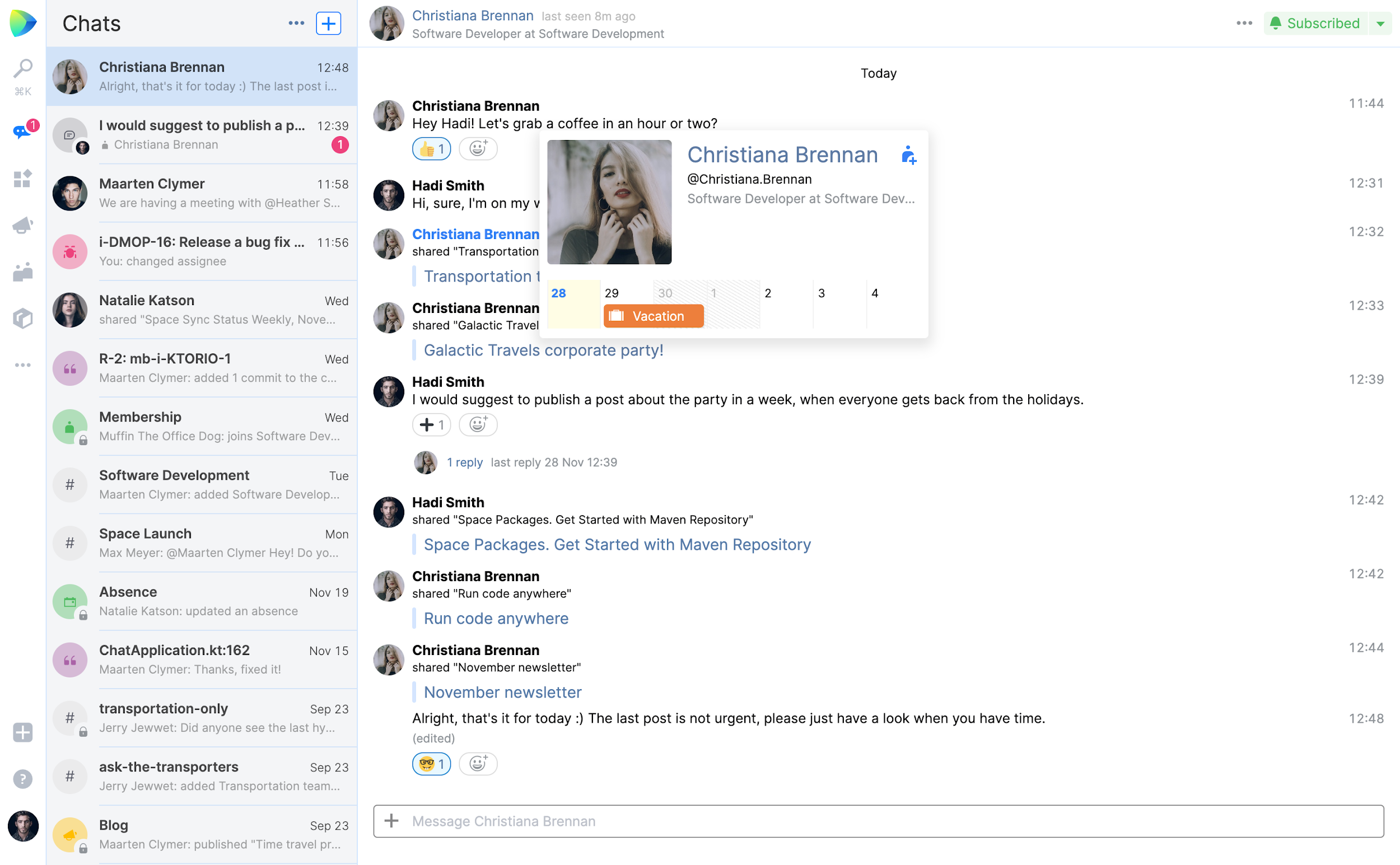 在Space中,团队的概念是一等公民。当您加入一个团队时,会被自动包含在与之相关的所有事务中,无论是会议、博客、源代码控制、日历还是假期,等等。这样就不需要创建诸如组之类的概念并确保每个团队成员也是相应组的一部分。