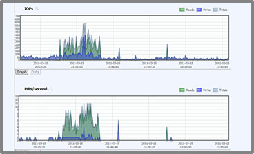 Arxscan在用户为存储阵列和切换选择的趋势时间表中逐分钟报告性能指标。图形视图辅以突出显示尖峰和异常的数据表。