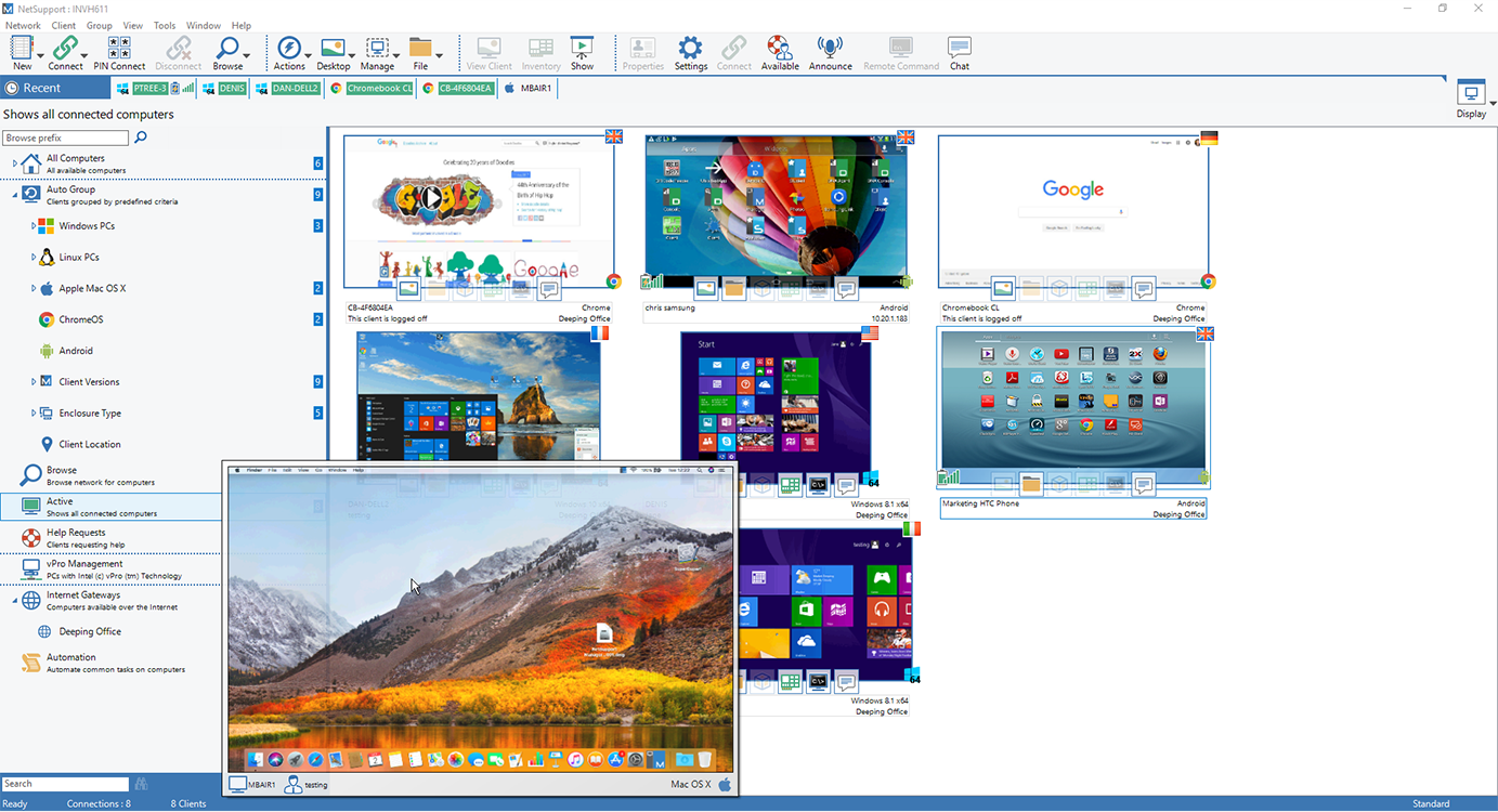 通过监视模式功能,用户可以同时显示所有连接的客户端工作站的缩略图视图。这些缩略图可以调整到适当的大小。此外,用户可以将鼠标悬停在某个缩略图上,查看每个选定PC的扩展视图。此视图可以切换到图标模式,在该模式下列出所有已知设备,并可选择叠加操作系统图标、位置标记、WiFi和电池详细信息等。