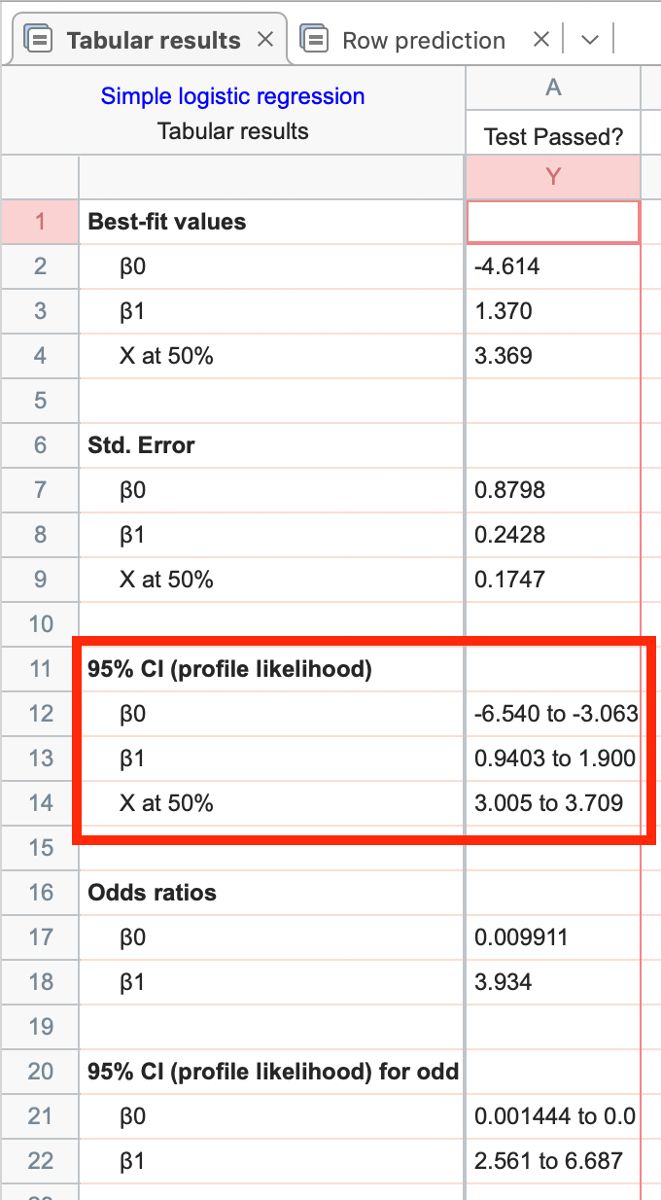 我们在Prism 8.3.0版本中增加了单一和多元逻辑回归分析功能,我们收到了来自全世界用户的大量反馈!基于全世界用户的请求和评论,我们对这些分析做了改进。首先,当执行简单的逻辑回归分析时,Prism为参数X产生一个Y=50的置信区间(如下图所示)。