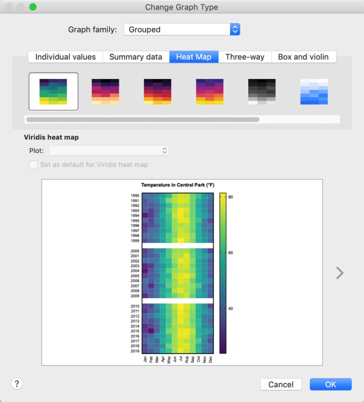 在为数据生成热图的时候,Viridis会作为新的默认色图,您可以轻松选择任一种其他新配色(如下图所示)。