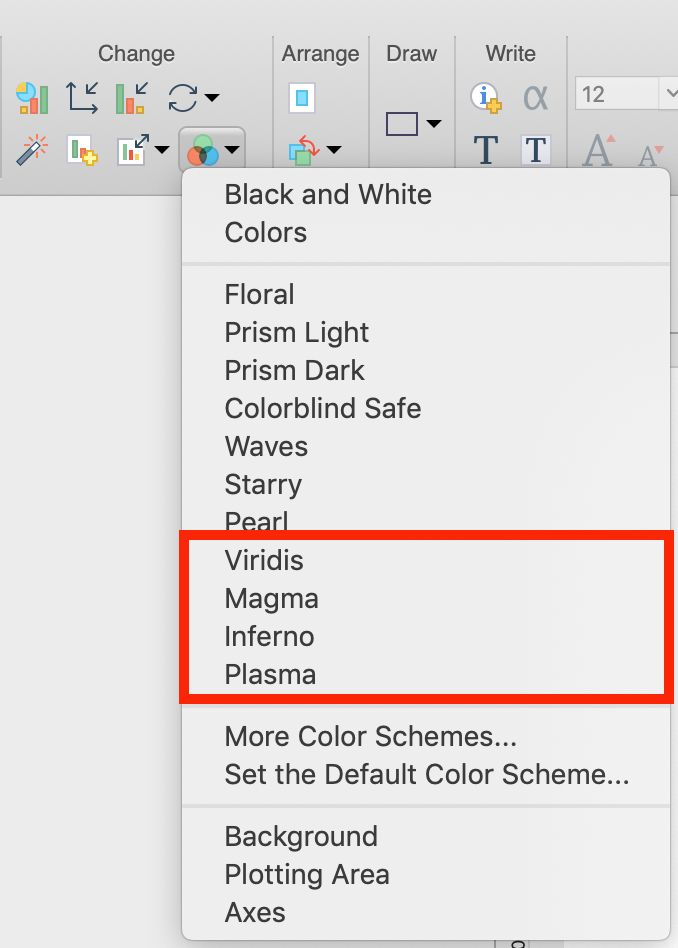 受这些色图的启发,我们还引入了四种新的配色方案,可以在其他图形上使用。您可以在工具栏的Change区域中使用“更改颜色”按钮(Change Colors)来找到这些新的颜色方案(如下图所示)。