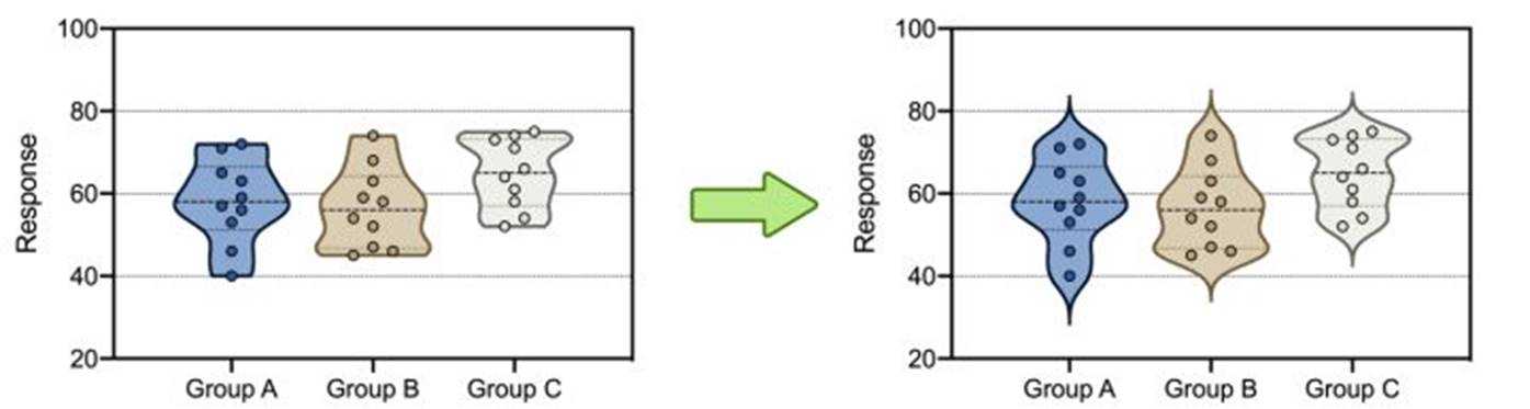 由于估计的数据点可能包含大于或低于输入值,完整的小提琴图通常会在图形上超过(高于或低于)这些值。在8.4.0版本中,我们现在为您提供了选项,可以按照您的要求,生成一个截断的小提琴图(下图左)或一个完整的小提琴图(下图右)。