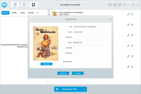 任何eBook Converter都带有一些周到且人性化的设计,使该程序更加人性化。得到一本书,但是封面不是您喜欢的版本?现在,借助此智能电子书转换器,您可以在转换前编辑所有重要且有用的元信息,包括标题,作者,出版日期,出版商等。