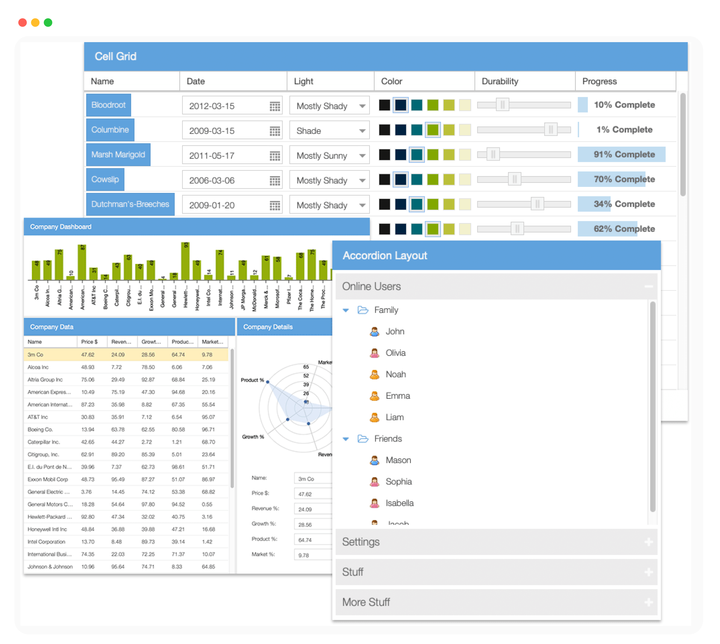 Ext JS 是一个功能强大的 UI 框架,包括 140+ 预集成的高性能组件。这些组件可以轻松地为大型数据集开发快速且一致的 UI,并带有内置主题以方便使用。