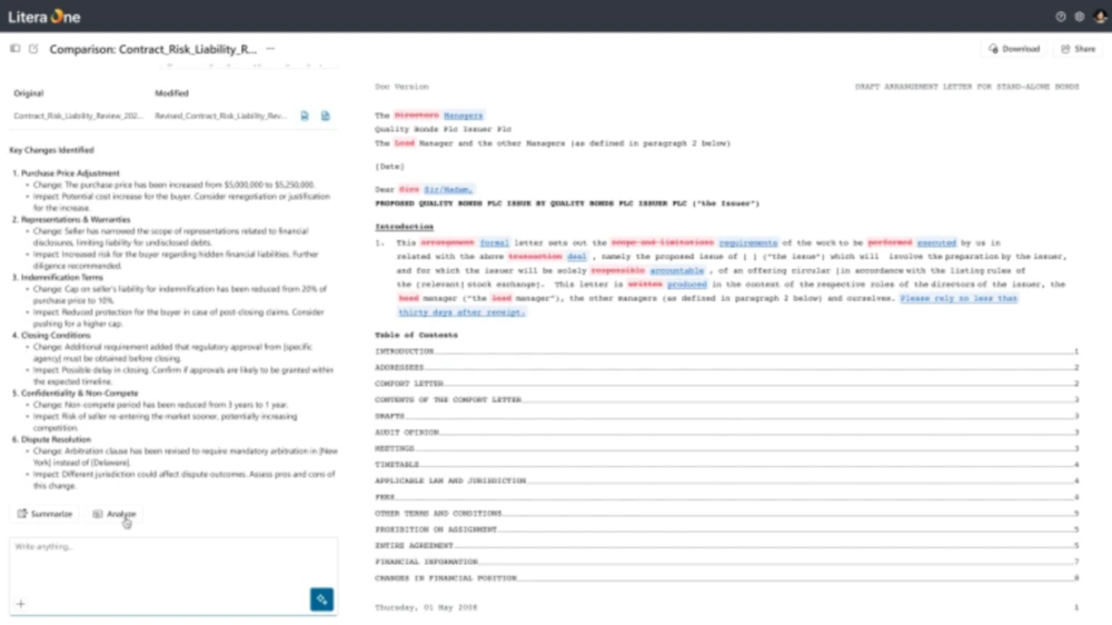 · 增强型智能比较-利用 Litera AI+ 生成文档对比摘要,清晰解释标注内容。通过批量对比优化效率,一步处理多个文件。