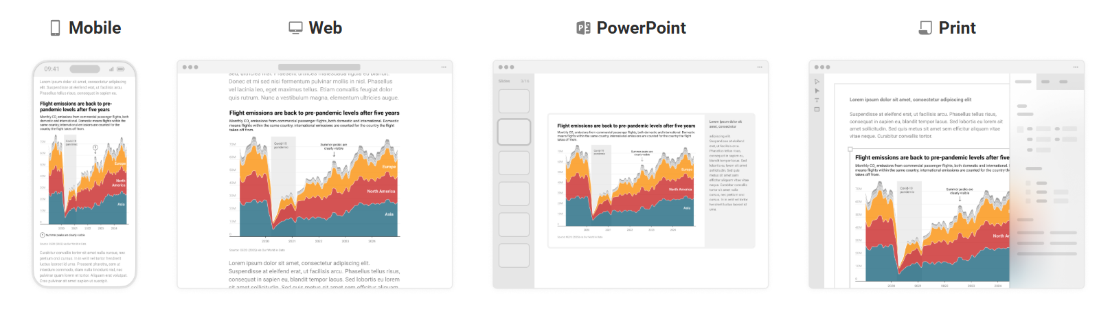 将您的可视化内容以任何格式嵌入到任何平台 ,从网站到演示文稿、印刷出版物等等。