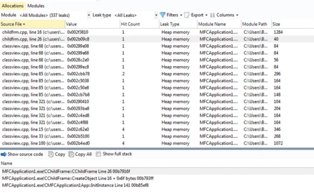 对于每次分配,都会提供大小、命中次数、类型和完整的调用堆栈,以帮助您快速定位泄漏并修复它。