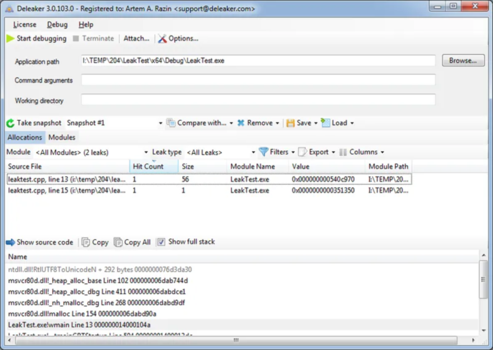 Deleaker 可以找到所有内存泄漏,并提供全面的内存分配详情