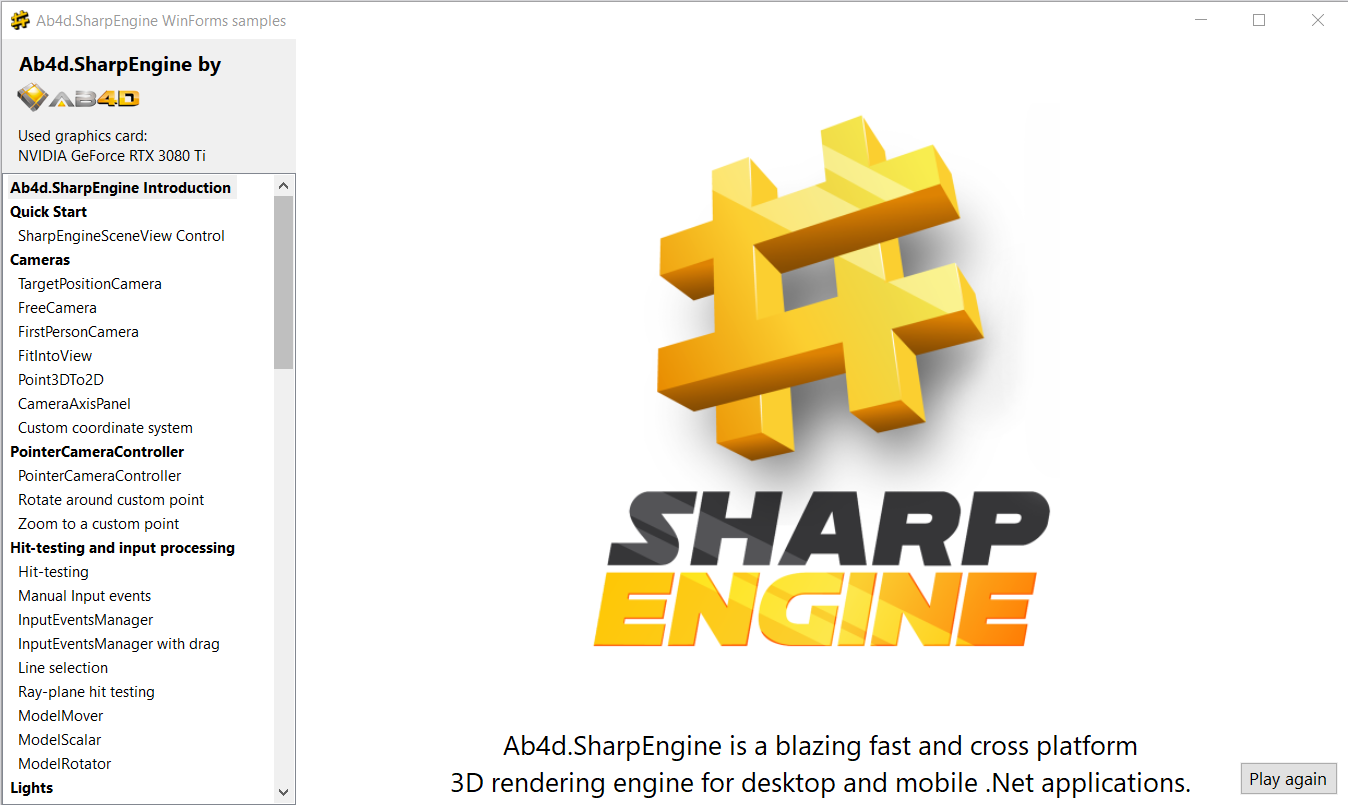Ab4d.SharpEngine 是一款适用于桌面、移动和浏览器应用的通用3D渲染引擎。专业级的3D图形要求3D对象呈现高度细节,线条极其平滑,文字清晰锐利。