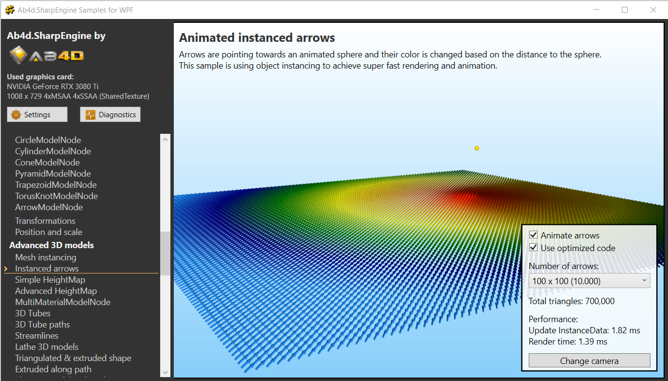 你只需将3D对象添加到场景中,并设置对象的属性。引擎会负责处理其余一切。这将为你节省大量工作,因为你无需再操心底层图形API,例如Vulkan管线、内存管理及其他复杂细节。Ab4d.SharpEngine的设计宗旨就是能够高效地渲染数十万个对象。