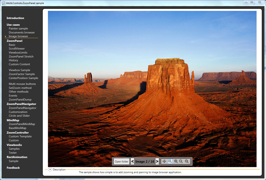 · ZoomPanel - 应用程序用户可通过其缩放或平移功能来控制 ZoomPanel 控件内容的主要控件。鼠标事件触发的操作由 ZoomPanel 的 ZoomMode 属性定义。