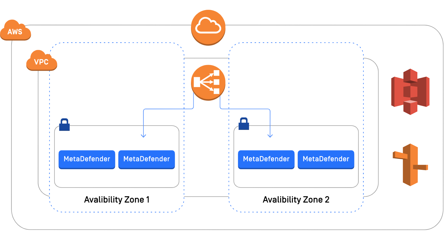 通过设置运行状况检查并将MetaDefender部署在不同的可用区域中,并在它们之前安装负载均衡器,可以确保服务不中断。阅读《AWS部署指南》中的详细信息。