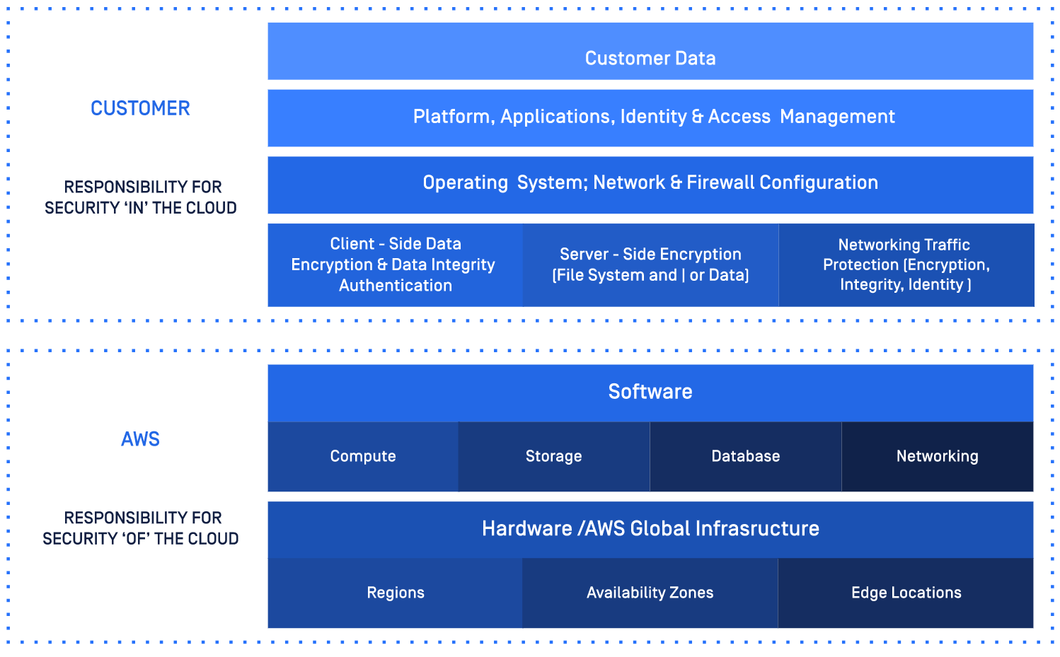 包括Amazon Web Services(AWS)在内的大多数云提供商都具有共同的安全责任模型,其中云计算客户负责保护其内容以及平台,应用程序,系统和网络的安全,以在云上进行部署。这是他们必须为其内部部署系统执行的相同保护。